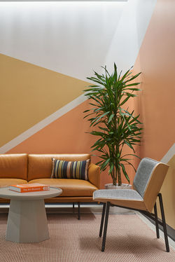 The design approach focuses on "Pinterest-y" touches throughout the floor plan with various wall graphics reflecting the company's brand colors, posters celebrating Pinner quotes, and a Pin wall mural of retro electronics designed by renowned artist and graphic designer Susan Kare. The use of contrasting materials and colors in the furniture and artwork help to define the various collaborative areas within the open office while enhancing the visual interest of each area throughout the floor.